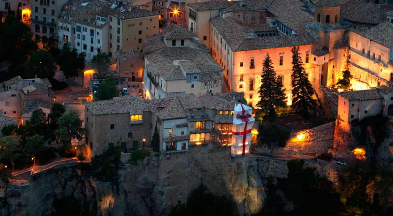 Cuenca ha envuelto sus Casas Colgadas, patrimonio de la Humanidad, con más de 900 m2 de seda china y un lazo de cuatro metros de largo a modo de regalo. La iniciativa, presentada por Borja García, Presidente de la Fundación de Turismo de Cuenca, se enmarca dentro de la campaña “Quédate con Cuenca”, que busca promocionar la conexión en AVE con Madrid y Valencia y ofrecer una imagen más moderna y atractiva de la ciudad.