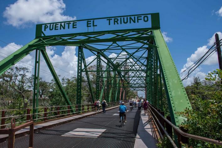Sagua es quizás una de las pocas ciudades de Cuba que un rio de verdad la divide en dos mitades, y sobre el imponente y caudaloso Rio cuelga un majestuoso puente de hierro, de calles y aceras caladas, que le imprime un toque de grandeza a la Villa, data de 1905 y es orgullo de los locales, pues de diversas maneras esta enraizado en la vida de los pueblerinos. Dicen los antiguos que si un forastero osara bañarse en las aguas del rio, quedaba prendado pues o no se iba o regresaba.