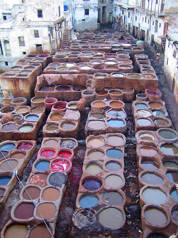 Sin embargo, el icono turístico más fotografiado de Fez no es otro que las tenerías, donde se tiñen las pieles que luego servirán para hacer ropa, zapatos u otros utensilios. Aún existen tres dentro de la ciudad, pero las más importantes y famosas son las de Chouaras Tanneries. Para llegar hasta allí, previamente se tiene que investigar dónde están o si no, aventurarse dentro de la medina y preguntar por ellas: seguro que alguien te acompañará. Una de las formas más fáciles para admirar ese paisaje multicolor es a través de algunas tiendas de pieles, que en los pisos superiores tienen vistas a las tenerías. Además, te explican su funcionamiento, siempre acompañado de un ramito de menta para hacer más soportable el fuerte hedor que sale de las picas, proveniente de las pieles frescas de animal puestas a macerar en orín y estiércol para dejarlas suaves.