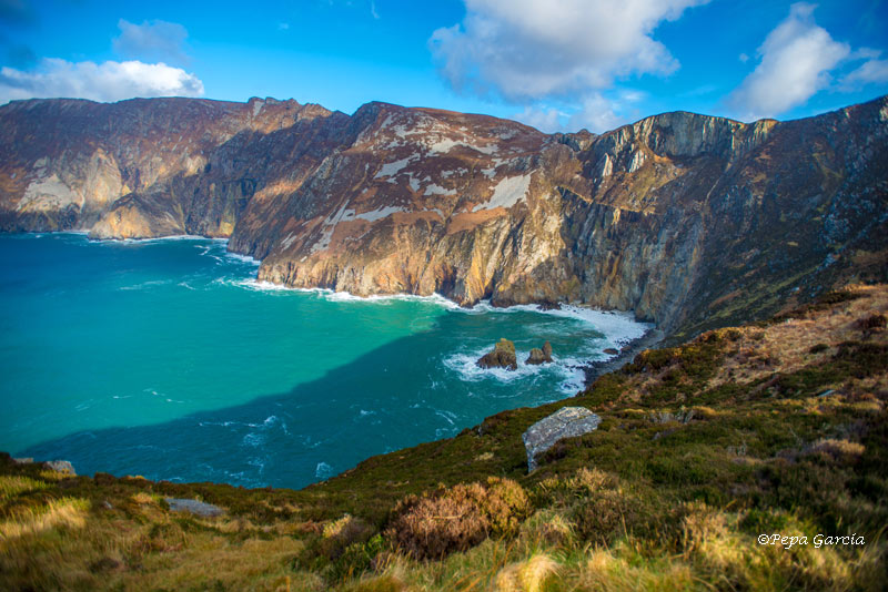 Pero Slieve League no es zona de bajíos para recoger algas, sino todo lo contrario: son unos de los acantilados más altos de Europa, con sus 601 metros. Y también unos de los más espectaculares: escarpados, con cascadas de agua que forman arcoíris cuando el viento sopla, sinuosos y repletos de colores por los diferentes tonos de las rocas, los líquenes y las plantas que, como los brezos, crecen hasta el borde del precipicio. Y, aún con todo eso, no son muchos los visitantes que se dejan caer por aquí, por lo que sigue siendo un lugar salvaje. Los más aventureros de los que vienen se atreven a recorrer el sendero trazado por las crestas de estas montañas que eran consideradas sagradas en épocas remotas. Y decimos que se atreven porque algunos tramos, como el One man's path (que, como su nombre indica, solo permite el paso de una persona dada su estrechez) son de todo menos aptos para quien sufra de vértigo o acrofobia. Eso sí, las vistas, no nos cansamos de decirlo, son grandiosas.